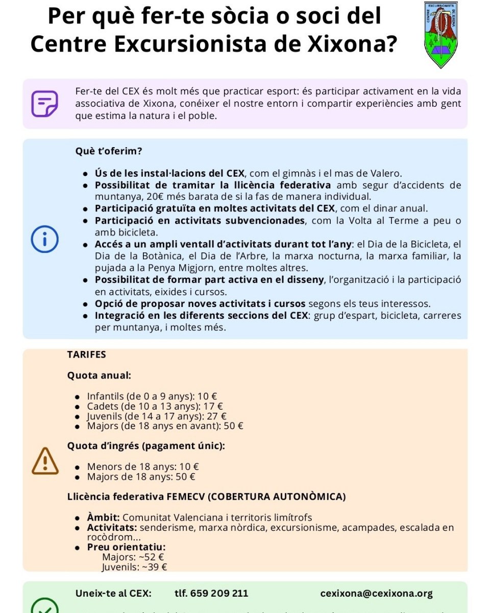 El Centre Excursionista de Xixona és una entitat esportiva, cultural i social que ja ha complit més de mig segle d' història. Un grup de joves apassionats per l'espeleologia van iniciar aquest camí fundant a l'any 1971 aquest club. La trajectòria no ha sigut fàcil i ara som una associació que ens hem mantingut creixent i evolucionant dins d'un poble relativament xicotet. Ens agrada la muntanya, ens agrada la Natura, ens agrada l'esport, ens agrada la cultura, ens agrada compartir moments, ens agrada donar vida i activitat al poble, ens agrada recuperar activitats antigues. Si a tu també t'agrada tot açò, potser tingues ací el teu lloc.